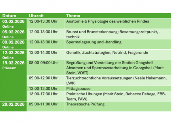 Der Kurs umfasst vier Online-Termine, bei denen theoretische Themen und Inhalte behandelt werden. Zusätzlich wird es einen Präsenztermin geben, mit Fachvorträgen und praktischen Übungen. Abschließend findet an einem separaten Termin die theoretische Prüfung statt.